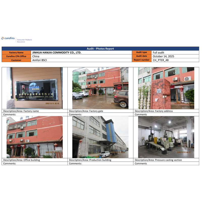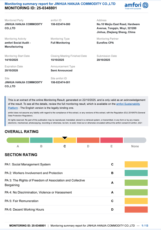 Jinhua Hanjia commodity Co., Ltd. оприлюднила результати свого аудиту BSCI. 14 жовтня компанія успішно пройшла професійну оцінку та отримала сертифікат класу C, який відповідає мінімальним вимогам, визначеним замовником. Термін дії цього сертифікату становить один рік. Аудит BSCI проводилося агентством EUROFINS, обраним замовником. Цей клієнт купував відкривачки для вина, аксесуари для вина та вироби з нержавіючої сталі, такі як шейкер для коктейлів, від нашої компанії протягом тривалого часу. Країна замовника вимагає від постачальників мати цю сертифікацію.