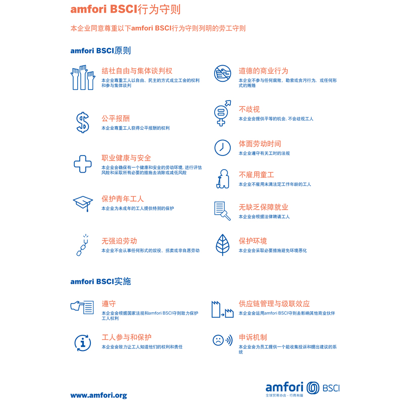 Відповідно до вимог правил BSCI наша компанія суворо дотримуватиметься трудових інструкцій, викладених у Кодексі поведінки Amfori BSCI, щоб забезпечити ефективне впровадження принципів BSCI. Під час виробничого процесу ми поважаємо права працівників створювати профспілки у вільний і демократичний спосіб і брати участь у колективних переговорах. Ми також зобов’язуємося не дискримінувати, уникати використання дитячої праці та гарантувати, що працівники отримують чесна практика праці та винагорода. Крім того, ми гарантуємо працівникам гідний робочий час та інші основні права.